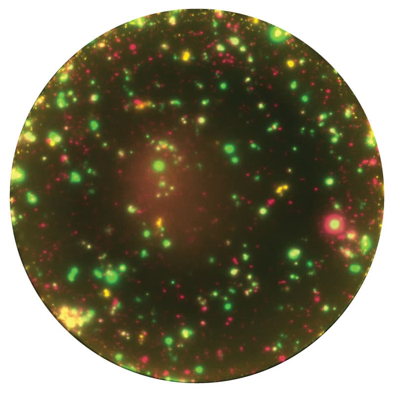 FluoroSpot is the multiplex version of ELISpot. Just like in the ELISpot assay, target proteins secreted by cells are captured by specific antibodies immediately after secretion and throughout the stimulation process, making it an extremely sensitive sandwich assay. The difference to ELISpot lies in the mode of detection: where ELISpot relies on an enzymatic reaction, FluoroSpot utilizes fluorescence. This allows multiplex analyses of several analytes simultaneously, enabling studies of cell populations with different functional profiles.