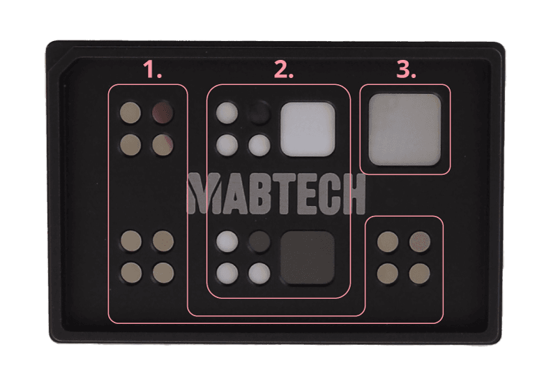 Different sections of the PQ-plate: 1. Tests focus and RAWspot algorithm in FluoroSpot. 2. Tests LED light intensity in FluoroSpot. 3. ELISpot test
