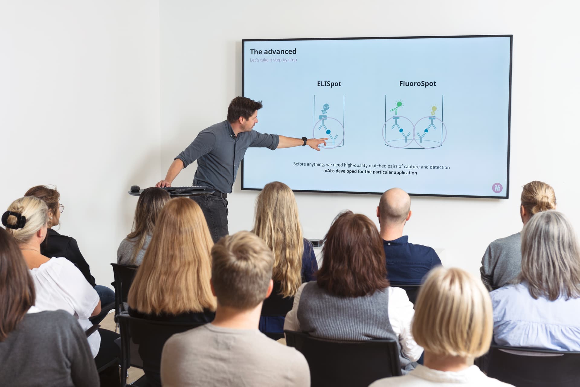Choosing the right setup can be crucial for some projects, often more so than developing a new assay from scratch. We’re here to help with this too. For instance, you can consult with us to determine which assay (ELISpot, FluoroSpot, ELISA) or analyte (IFN-γ, IL-4, IgG, IL-6, etc.) best matches your project plans. Once you’ve made your decision, we'll advise you on setting things up in the lab or even run an application workshop to train your team.