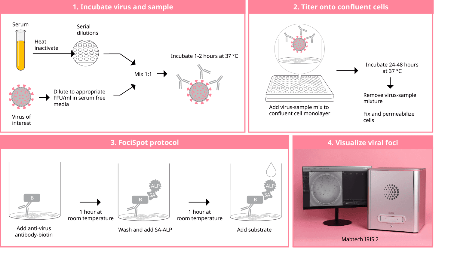 We know each viral assay is unique, but we’ve streamlined the detection and reading steps. If we take a typical focus reduction neutralization test (FRNT) for example, dilutions of a serum sample containing potential neutralizing antibodies (nAbs) is mixed with a known titer of virus. This mixture is then added to a monolayer of cells in a 96-well plate and incubated overnight.