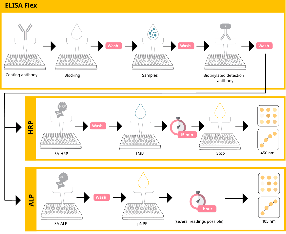 Tip! HRP+TMB reaction is stopped and then read, whereas ALP+pNPP allows for readings at different time points.